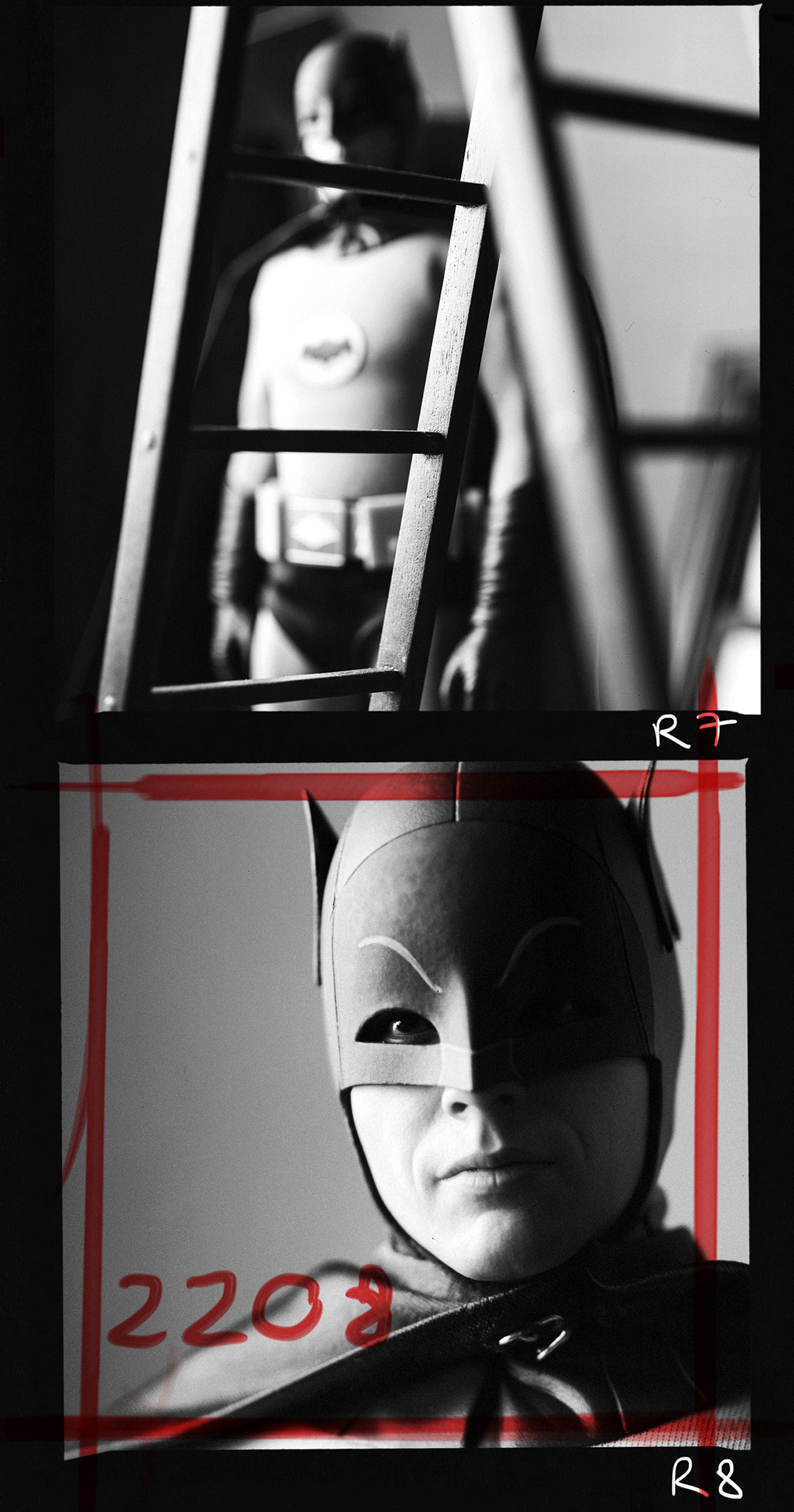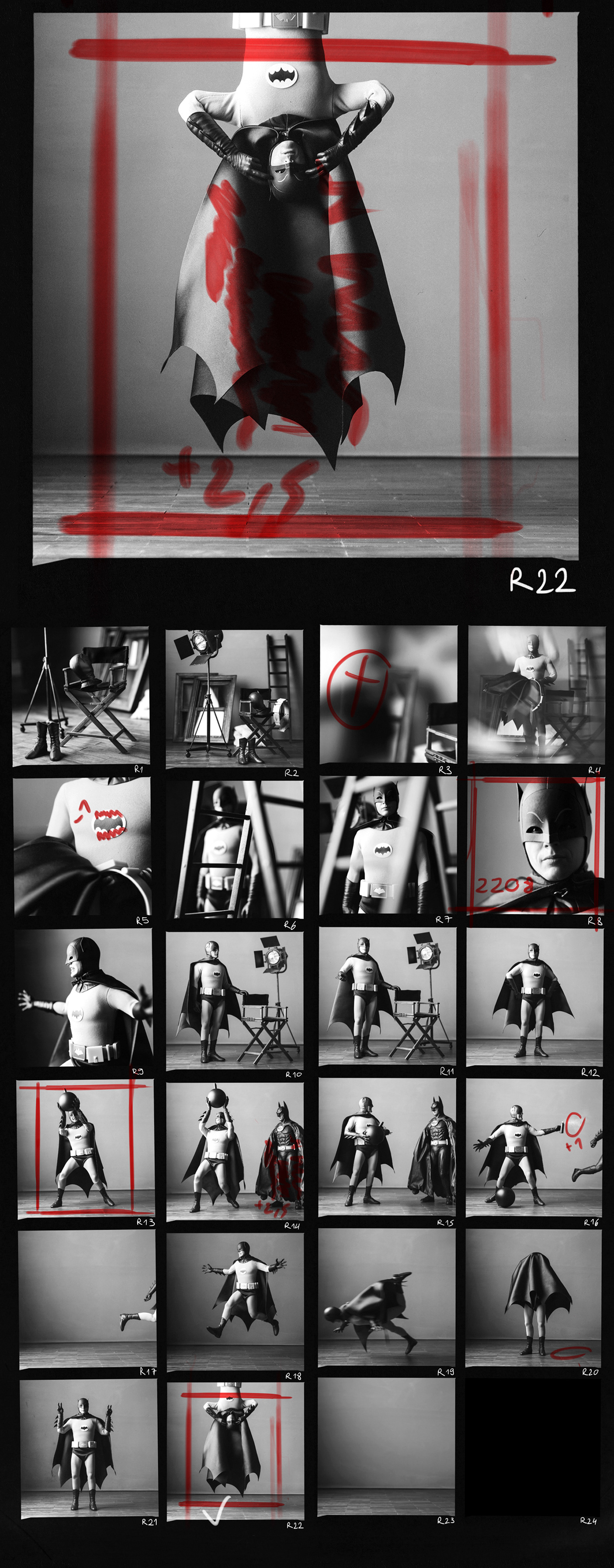 I created these artworks for L'expo Des Chauves Souris et Des Hommes (Of Bats and Men Exhibition) at Galerie SAKURA Paris. For this particular work I wanted to do something different with Adam West's Classic Batman, which is a great subject on its own. Being a photographer who almost completely missed out on shooting on film, I always had on the back of my mind one day to do something fun with contact sheets. Their notes, frame markings, exposure notes... I always have been fascinated by them. They almost looked like artworks on their own. So... for this particular project, I wanted to bring the best of both worlds together. The contact sheet from an imaginary photoshoot with Adam West. This was the idea behind this project.