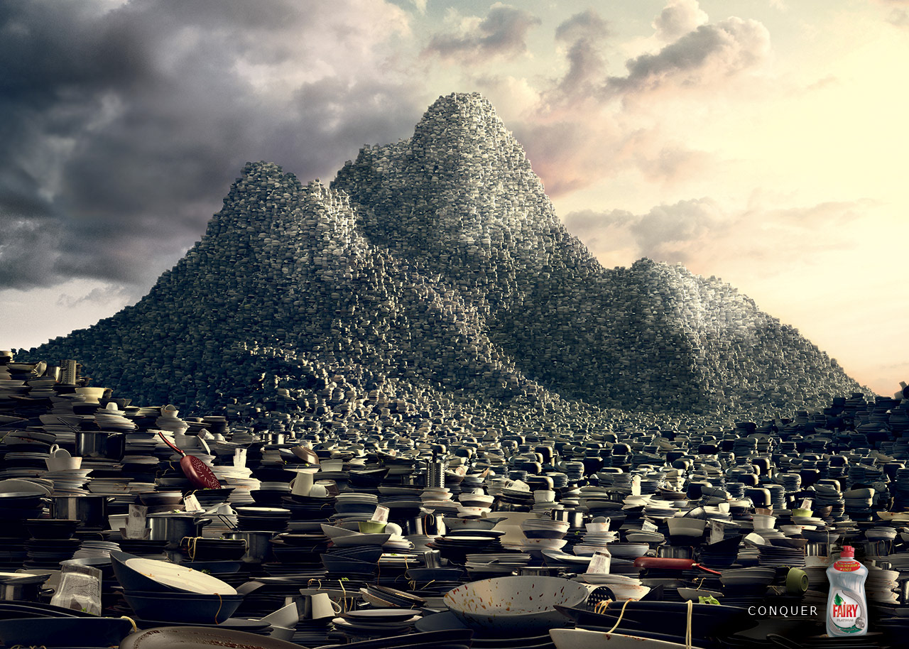 The housewives’ life is hardly dominated with piles of dishes, generally several times a day. Thankfully, they are aware of Fairy’s extremely impressive grease cutting power and the durability of a bottle. The latest ad gets the right perspective in this context, by focusing on Fairy’s ultimate power which is capable to wash ten thousands of plates. The visual focuses on the toughness of dishwashing and acknowledges that with just one bottle of Fairy, you have the power to conquer even the “mountains”. The photographer credit bears the signature of Cihan Ünalan who shot approximately 400 different combinations of the plates and the “CGI blended with real photos” is done in 12 days by Magic Group Media, Amsterdam.